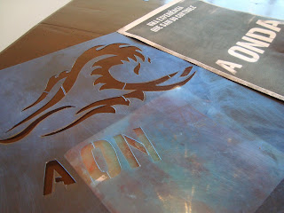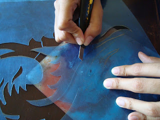 3 - Depois de ter a imagem copiada, utilize um estilete para o corte. Dica: use um suporte, como um azulejo, que ajuda o estilete a deslizar melhor e não arranha a mesa! Mão firme! Se lembre que é a área que será preenchida pela tinta e que vai ser retirada. Se a área de preenchimento for muito grande é necessário fazer umas pontes fininhas de um extremo ao outro, para que depois o stencil não amasse ou dobre.